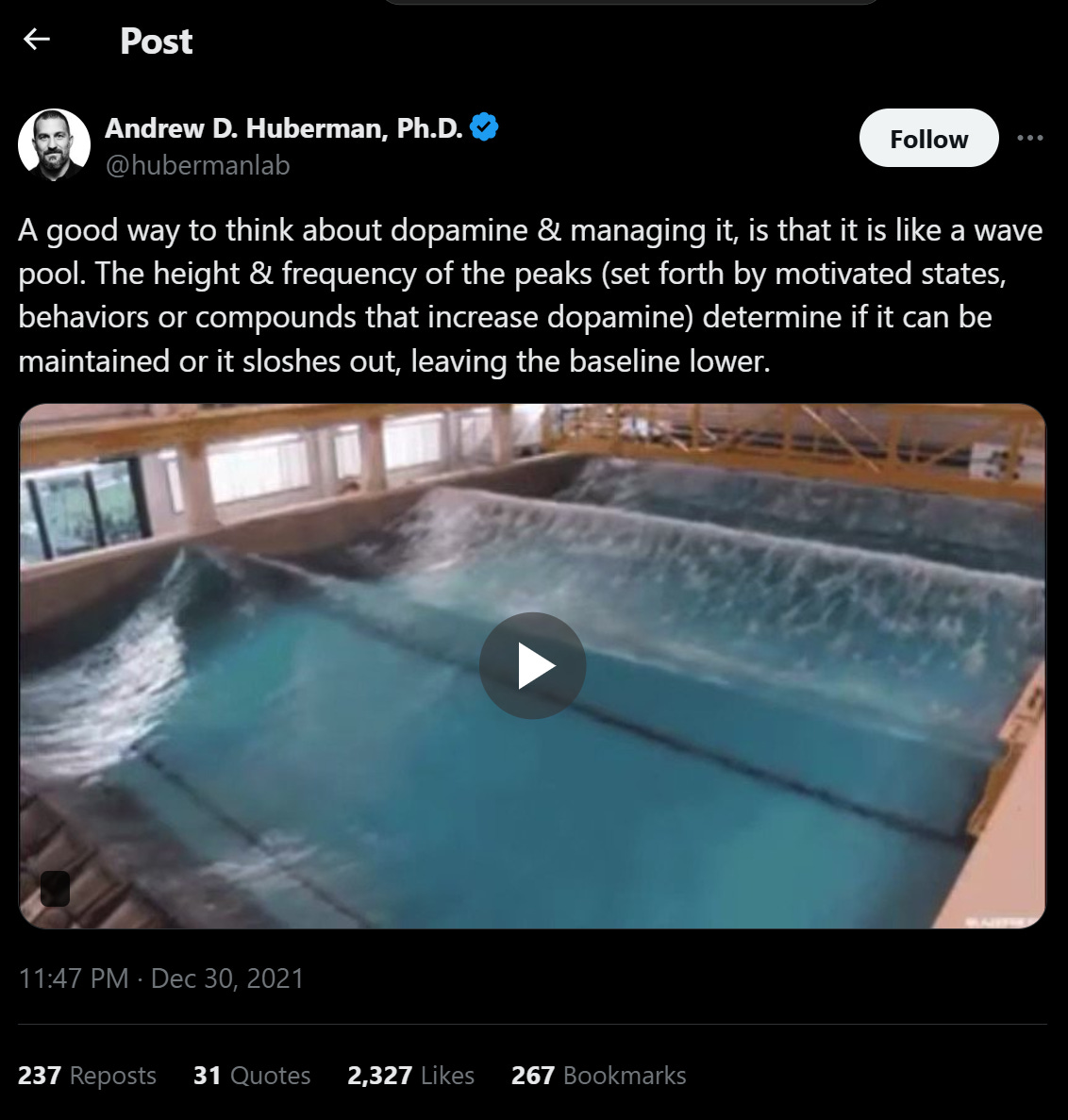I first want to go through the wavepool analogy as posed by MD Kyle Gilette on Huberman Lab, criticize it, then introduce a new analogy that recently emerged from my subconsious: the dopamine fire.